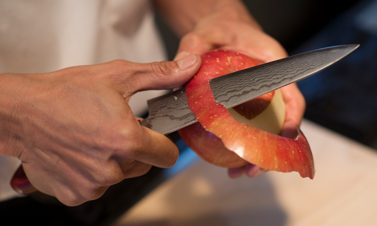 24,200円(税2,200円)コバルトステンレスとダマスカス鋼が融合した新開発包丁。ZA18鋼使用で軽量・切れ味抜群、栗柄が洗練されたデザインを体現。 -
