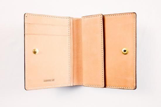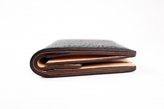 イレギュラーシュリンク 二つ折り財布は、タンナー・山陽が独自開発した革「イレギュラーシュリンク」を使用した日本製二つ折り財布です。革の深いシボと浅いシボが混在し、立体感のある個性的な表情を楽しめます。内装にはピットヌメ革 キナリ ヌバックを採用し、使い込むほどに飴色に経年変化します。札入れ・コイン入れ・カードポケットを備え、日常使いに便利です。TAANNERR熟練職人が一つひとつ丁寧に仕上げています。革本来の風合いを活かしているため、色味やシボの表情は一点ごとに異なります。小さな傷や色ムラがある場合がありますので予めご了承ください。表面は付属のオリジナルケアクリームでメンテナンス可能です。内装はブラッシング推奨です。高級感と使いやすさを兼ね備え、ギフトや自分用にもおすすめの二つ折り財布です。