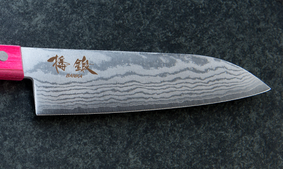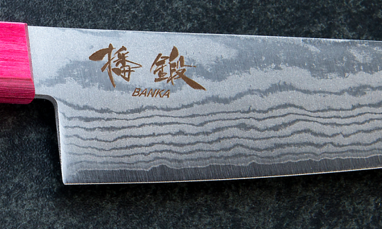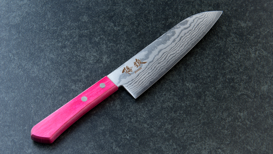 包丁の柄には珍しい鮮やかな赤紫色と、積層鋼の艶やかさが互いに引き立てあい、唯一無二の個性的な華やかさを演出しています。